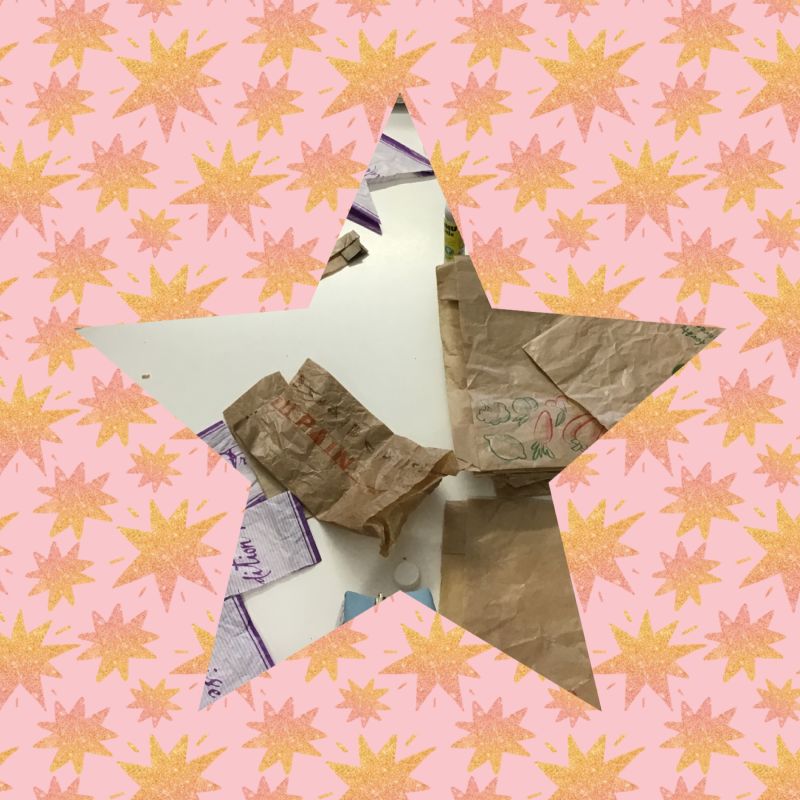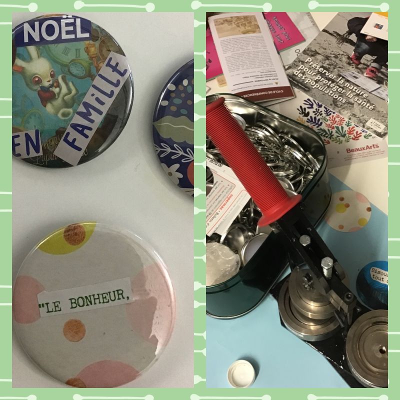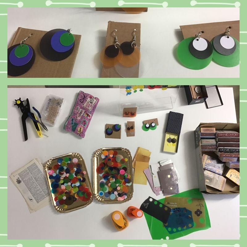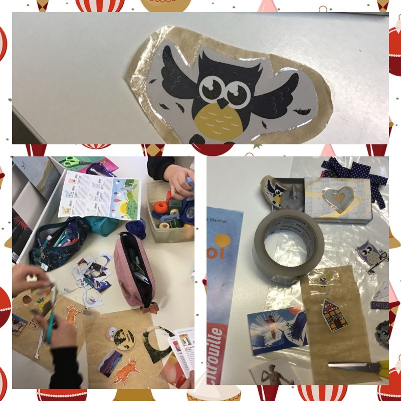 Vieux dictionnaires et anciens livres que l'on a exceptionnellement le droit de découper ou déchirer, anciennes couvertures plastiques de cahiers, emballages papiers de revues et enveloppes kraft, opercules métalliques, ou encore sacs en papier kraft, ont permis chaque midi à une quinzaine d'élèves de bricoler dans la bonne humeur et de rapporter des petits cadeaux à offrir autour d'eux pour les fêtes.