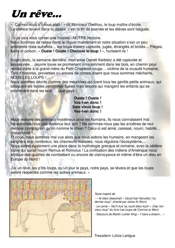 A l’occasion du salon du livre jeunesse multilingue de Pluguffan, les élèves de 4e et 3e bilingue breton ont participé au concours d’écriture de texte sur le thème du retour du loup.