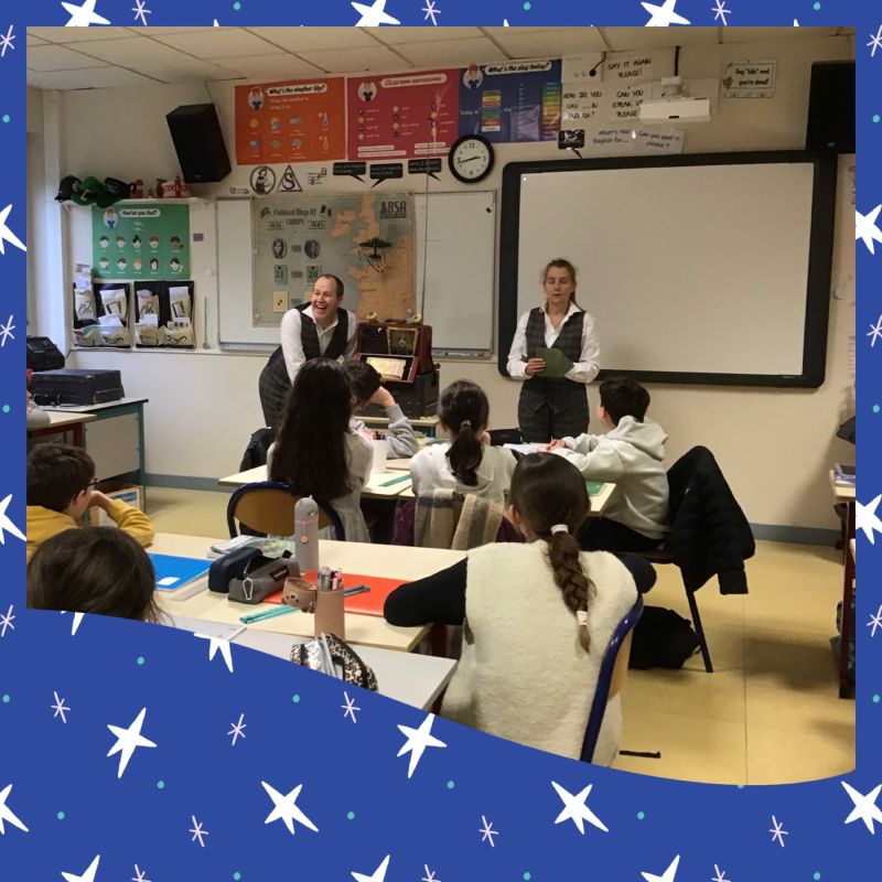 Les 5 classes ont également pu bénéficié d'une intervention surprise d'une compagnie anglaise pour un spectacle dans la classe le tout dans la bonne humeur, et surtout en anglais ! Merci à Suzy et Jeff de leur avoir fait passé un agréable moment dans la langue de Shakespeare !